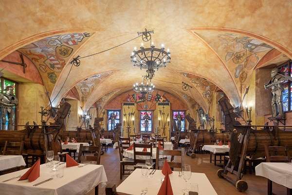 Rytířský sál restaurace Old Armoury Prague odráží atmosféru pozdního středověku. Původně se zde nacházela jízdárna. Dnes patří restaurace díky Rytířskému sálu s bohatou výzdobou historickými replikami zbraní a brnění zbrojnošů, rytířů, mušketýrů a rustikálními dekoracemi a díky interiéru s klenutými stropy k jedné z nejzajímavějších historických restaurací v Praze. Na hosty zde dýchne unikátní atmosféra historie v kombinaci s gurmánským zážitkem zdejších mistrů kuchařů, kteří do historického prostředí restaurace připravili tradiční české menu kladoucí důraz na vždy čerstvé suroviny nakoupené v maximální míře od lokálních dodavatelů. V předkrmech zaujmou např. Grilované pikantní klobásky s cibulovým salátkem s chilli papričkami a estragonem, hrubozrnnou hořčicí a chlebem. V hlavních jídlech pak nechybí české klasiky jako Pečené vepřové koleno se zelným salátem, krémovým křenem, hořčicí a chlebem nebo Vepřová pečená žebra s pikantní kouřovou marinádou, zelným salátkem, marinovanou cibulí a chlebem, ale i vegetariánská jídla jako Rozpečený kozí sýr s vlašskými ořechy a medem, rukolou, červenou řepou a slunečnicovými semínky. Mezi dezerty jsou stálicemi Lívanečky s borůvkovým žahourem, skořicovým cukrem a zakysanou smetanou nebo populární Dukátové buchtičky s teplým vanilkovým krémem. Nabídka vinného lístku, který je zaměřen na vysoce kvalitní vína tuzemské produkce už jen podtrhne příjemně strávený čas v prostředí Rytířského sálu.
